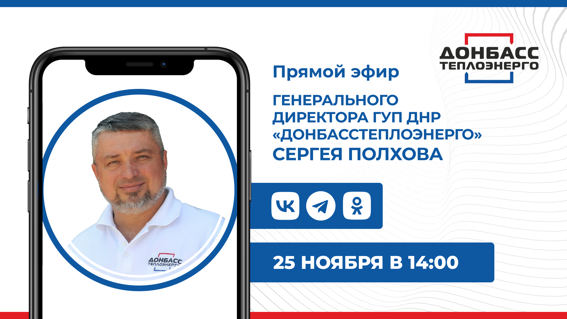 Во вторник, 25 ноября, в 14:00 по поручению Главы ДНР Дениса Пушилина состоится прямой эфир с генеральным директором ГУП ДНР «Донбасстеплоэнерго» Сергеем Полховым.